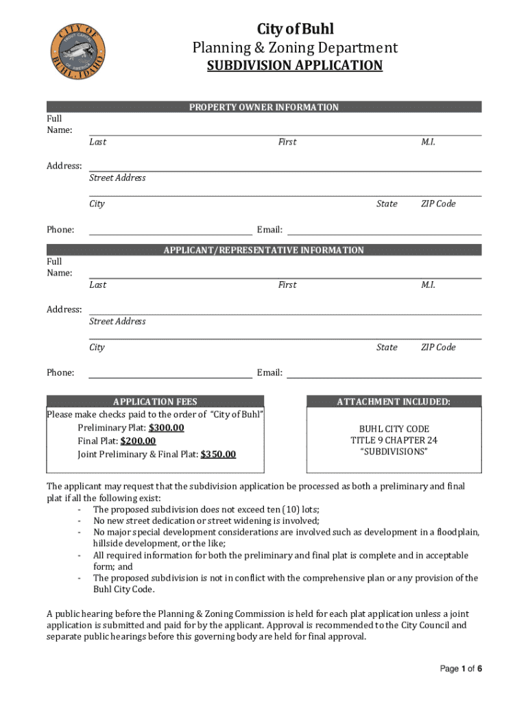 City of Buhl Planning & Zoning Department SUBDIVISION APPLICATION PROPERTY OWNER INFORMATIONFull Name: LastFirstM.I.Address: Street Address City Phone:StateZIP CodeEmail: APPLICANT/REPRESENTATIVE