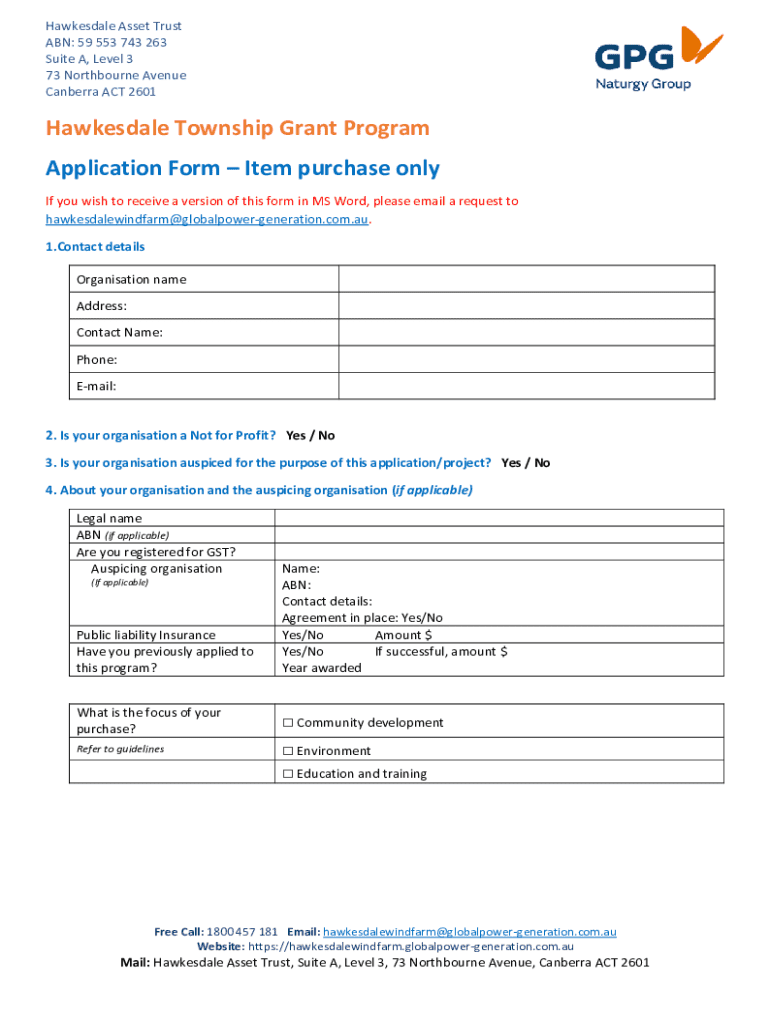 Hawkesdale Asset Trust ABN: 59 553 743 263 Suite A, Level 3 73 Northbourne Avenue Canberra ACT 2601Hawkesdale Township Grant Program Application Form Item purchase only If you wish to receive a version