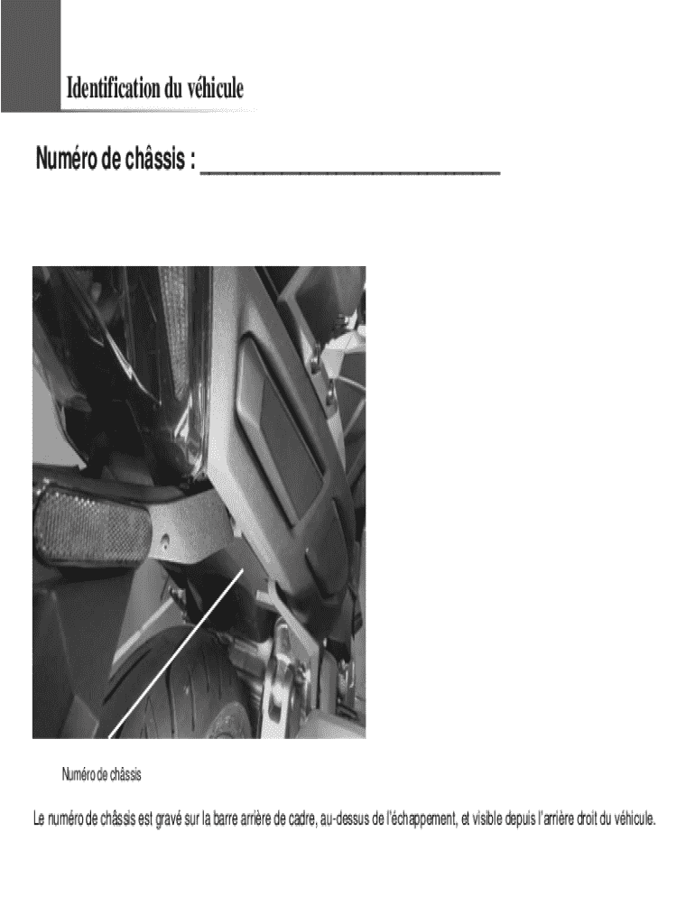 Identification du vhicule Numro de chssis : ___Numro de chssisLe numro de chssis est grav sur la barre arrire de cadre, audessus de lchappement, et visible depuis larrire droit du vhicule.Notes importantes