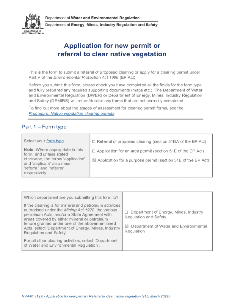 Application for new permit or referral to clear native vegetation This is the form to submit a referral of proposed clearing or apply for a clearing permit under Part V of the Environmental Protection