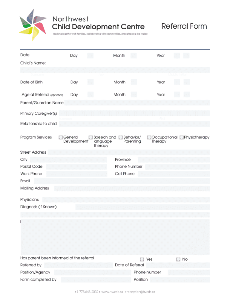 This document is a referral form for parents or guardians to provide details necessary for the assessment and assistance of their child in various programs and therapy services. It includes sections for personal information, program services needed, and relevant medical information.