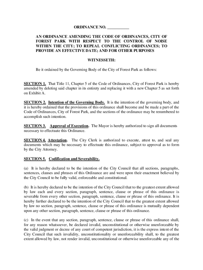 This ordinance amends the City of Forest Park\'s Code of Ordinances concerning noise control, aiming to establish regulations that reduce excessive noise and ensure the comfort and safety of residents. It details prohibitions on various noise-making activities, outlines enforcement protocols, and includes provisions for sound amplification devices.