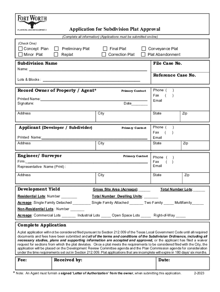 Complete the application form for subdivision plat, ensuring all sections are filled in accurately.