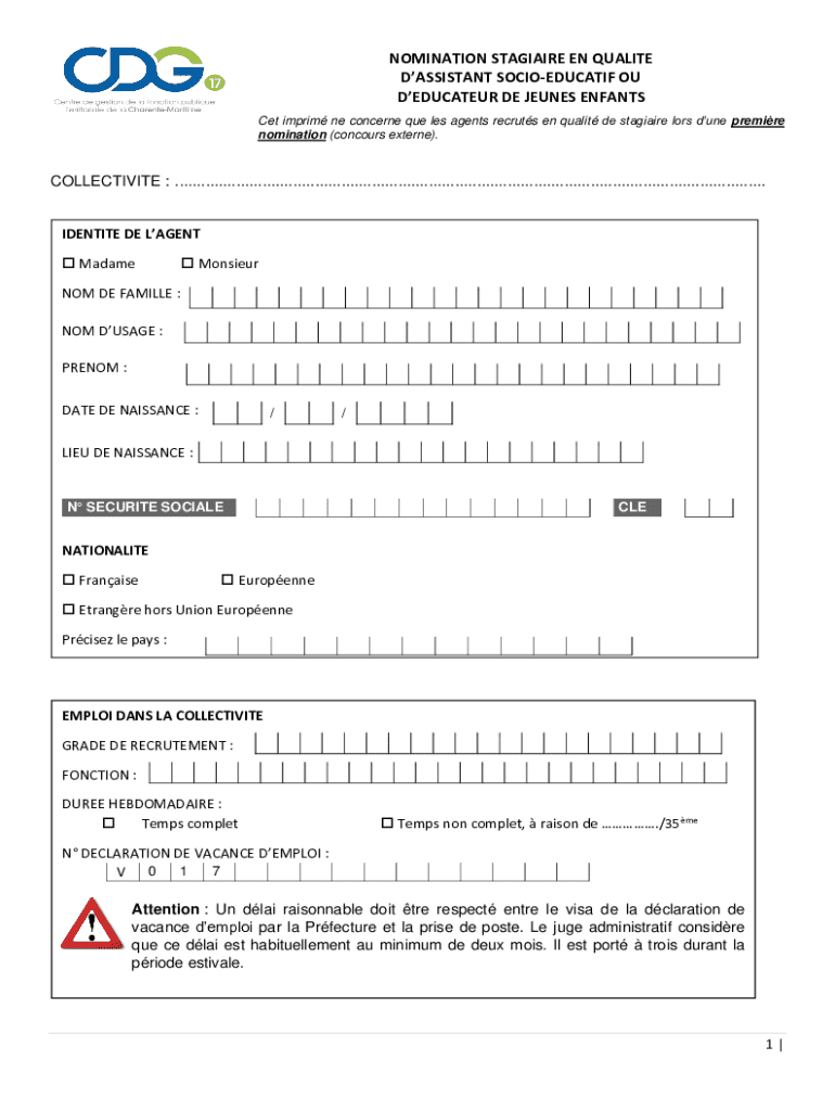 NOMINATION STAGIAIRE EN QUALITE DASSISTANT SOCIOEDUCATIF OU DEDUCATEUR DE JEUNES ENFANTS Cet imprim ne concerne que les agents recruts en qualit de stagiaire lors dune premire nomination (concours