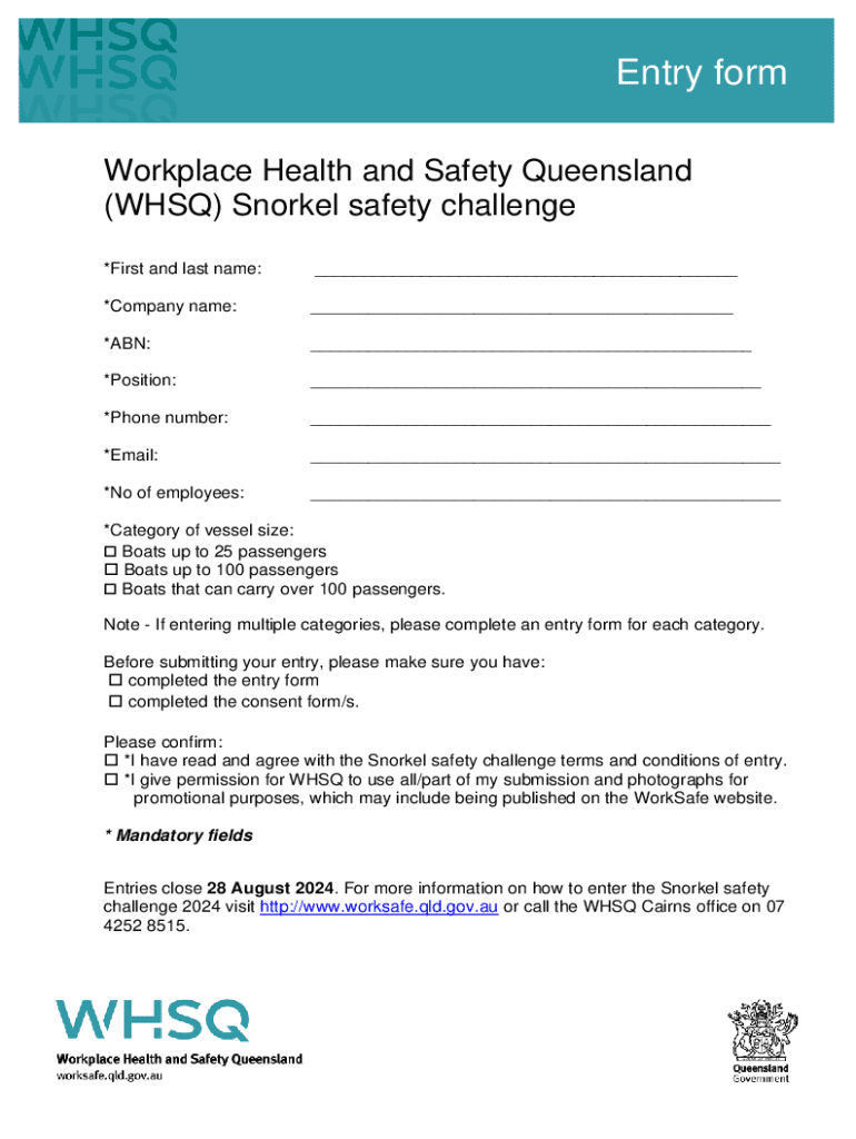 Entry form Workplace Health and Safety Queensland (WHSQ) Snorkel safety challenge *First and last name:___*Company name:___*ABN:___*Position:___*Phone number:___*Email:___*No of employees:___*Category