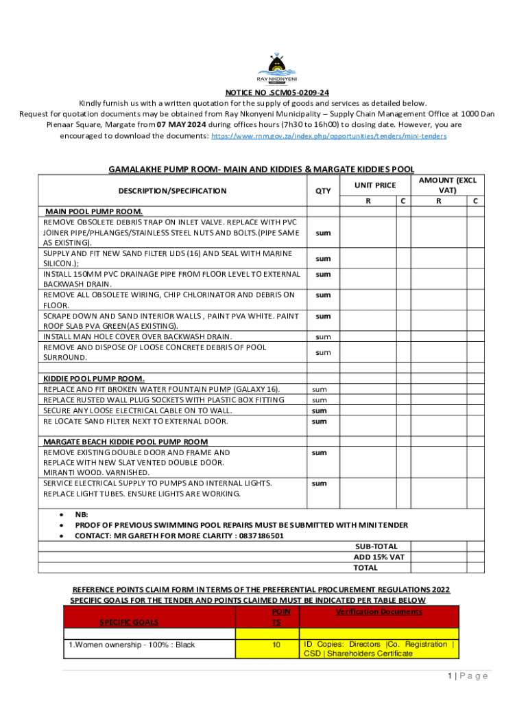 This document serves as a request for written quotations from suppliers for the supply of goods and services required for the Gamalakhe Pump Room and Margate Kiddies Pool. It outlines the specifications, quantities, and pricing requirements for the necessary repairs and installations. Interested parties must follow specific procurement regulations and submit all mandatory documents to ensure their bids are considered.