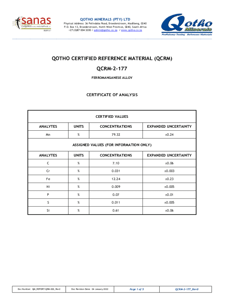 This document certifies the analytical values of a ferromanganese alloy reference material, QCRM-2-177, providing detailed information on its chemical composition, preparation methods, analysis procedures, and certification process. It includes assigned values for various analytes and is designed for use in laboratory quality control and method verification.