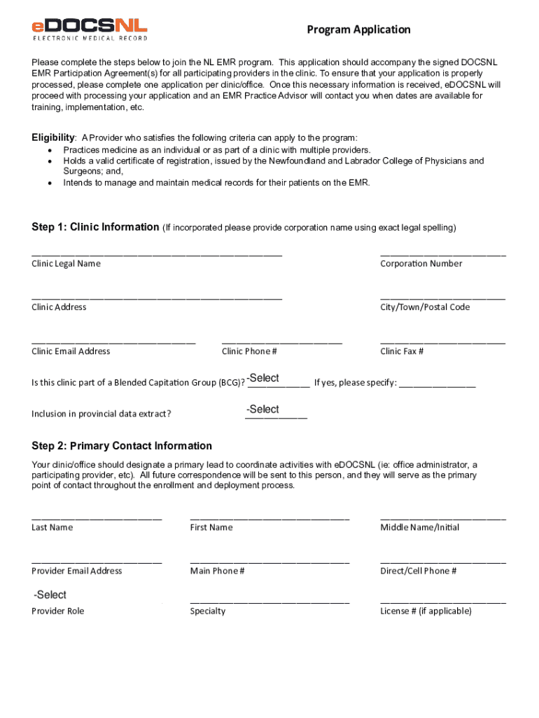 This application is necessary for clinics and providers in Newfoundland and Labrador to join the NL EMR program. It includes the steps to provide clinic information, primary contact details, signing authority, a list of participating providers, and authorized users. The application must be submitted along with the signed EMR Participation Agreement, and is processed by eDOCSNL, who will contact the designated primary lead for further coordination of training and implementation.