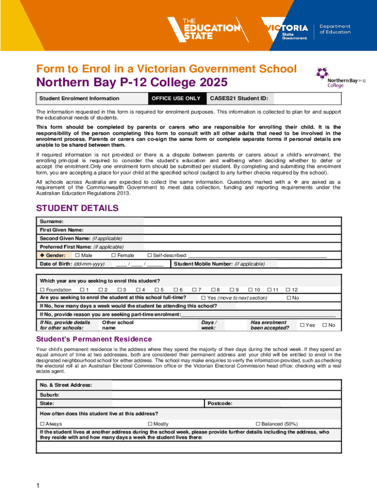 Form to Enrol in a Victorian Government SchoolNorthern Bay P12 College 2025 Student Enrolment InformationOFFICE USE ONLYCASES21 Student ID:The information requested in this form is required for enrolment