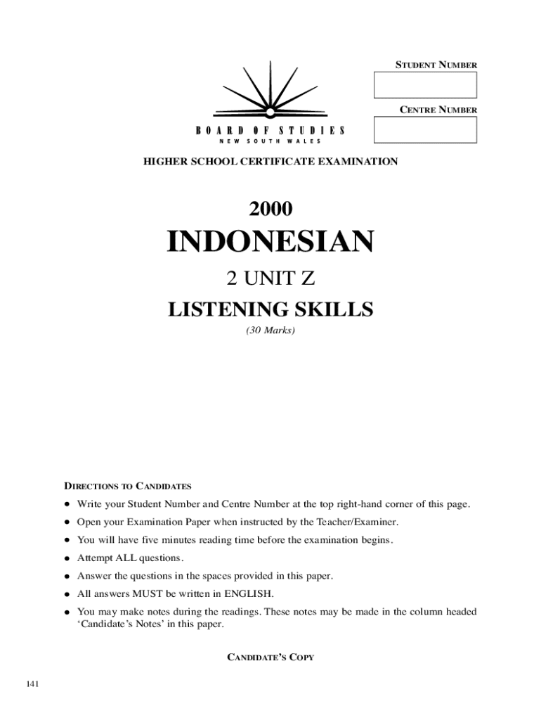 STUDENT NUMBERCENTRE NUMBERHIGHER SCHOOL CERTIFICATE EXAMINATION2000INDONESIAN 2 UNIT Z LISTENING SKILLS (30 Marks)DIRECTIONS TO CANDIDATES Write your Student Number and Centre Number at the top righthand
