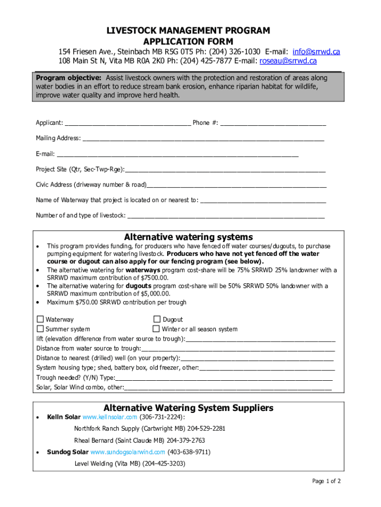 This application form is designed for livestock owners seeking assistance in protecting and restoring areas along water bodies, promoting better water quality, enhancing wildlife habitat, and improving herd health. It includes sections for applicant information, project details, and funding options for alternative watering systems and fencing projects.