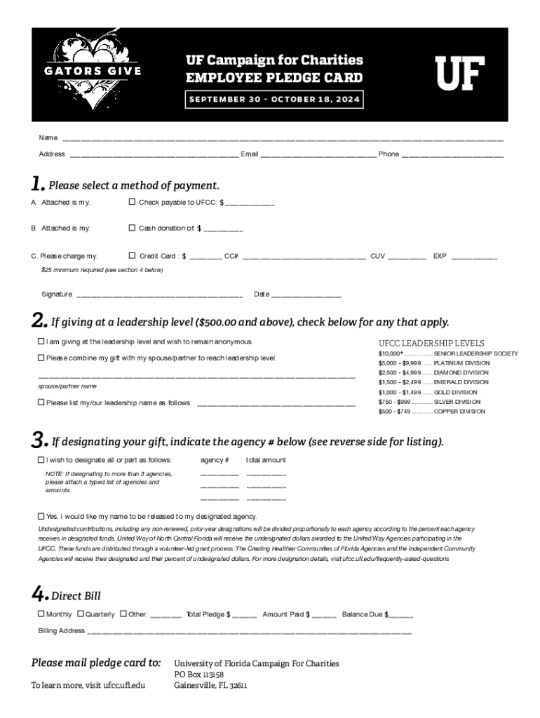 This document serves as a pledge card for the UF Campaign for Charities, allowing employees to donate to various charities through methods such as check, cash, or credit card. It includes options for leadership level recognition, agency designation, and provides information on agencies participating in the campaign.