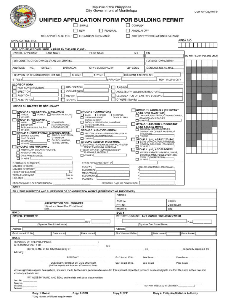 This document serves as an application form for obtaining building permits in the Republic of the Philippines, specifically for Muntinlupa City. It is applicable to various categories such as new constructions, renovations, and other types of building-related requests. The form requires detailed information about the applicant, the proposed construction, and compliance with necessary regulations.