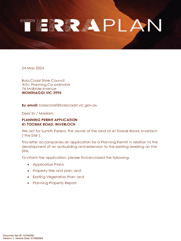 24 May 2024 Bass Coast Shire Council Attn: Planning Coordinator 76 McBride Avenue WONTHAGGI VIC 3995 By email: basscoast@basscoast.vic.gov.au Dear Sir / Madam, PLANNING PERMIT APPLICATION 41 TOORAK