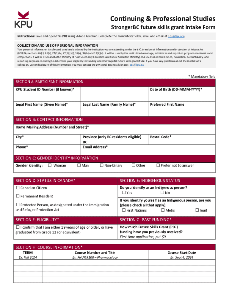 This form is used to apply for the StrongerBC future skills grant, which provides funding to eligible participants for educational programs. It requires personal information, course details, and consent to the collection of personal data under the B.C. Freedom of Information and Protection of Privacy Act.