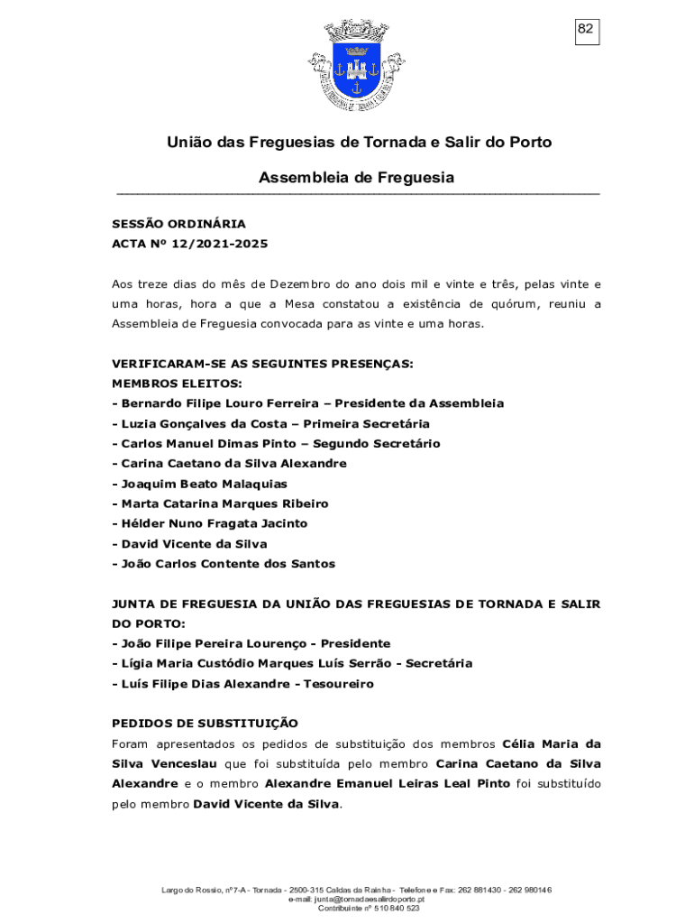 82Unio das Freguesias de Tornada e Salir do Porto Assembleia de Freguesia___SESSO ORDINRIA ACTA N 12/20212025 Aos treze dias do ms de Dezembro do ano dois mil e vinte e trs, pelas vinte e uma horas,