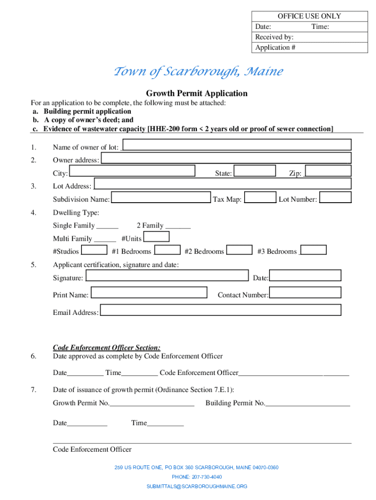 This document provides an overview of the requirements and procedures necessary for obtaining a building permit for new home construction in Scarborough, Maine. It outlines the applications needed, associated fees, and additional considerations for various types of residential projects.