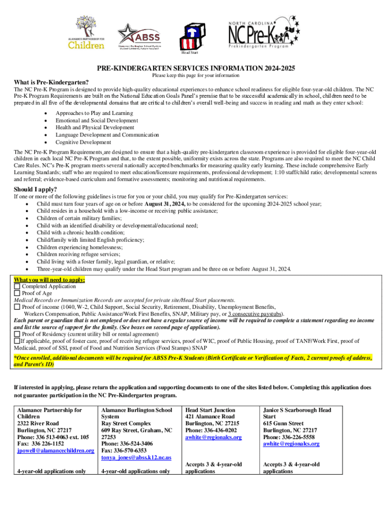 This document provides detailed information regarding the NC Pre-K Program for the 2024-2025 school year, including eligibility requirements, application processes, and necessary documentation for families interested in enrolling four-year-old children in high-quality educational experiences to enhance school readiness.