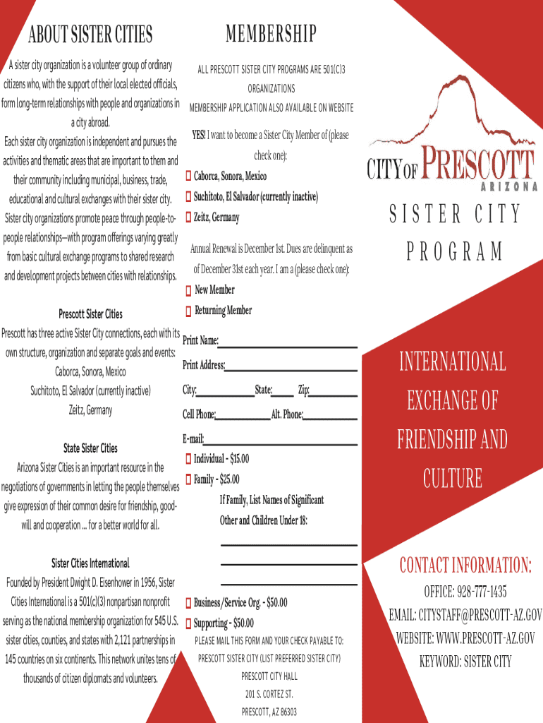 The document provides details about becoming a member of the Prescott Sister Cities program, which aims to foster relationships and cultural exchanges between Prescott and its sister cities: Caborca, Sonora, Mexico; Suchitoto, El Salvador; and Zeitz, Germany. It outlines membership options, benefits, and the impact of these partnerships in promoting peace and cooperation.