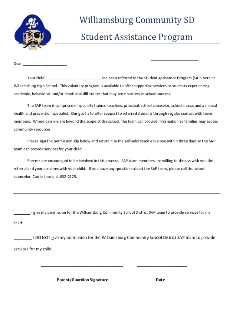 Williamsburg Community SD Student Assistance Program ___ Dear ___, Your child ___, has been referred to the Student Assistance Program (SAP) here at Williamsburg High School. This voluntary program