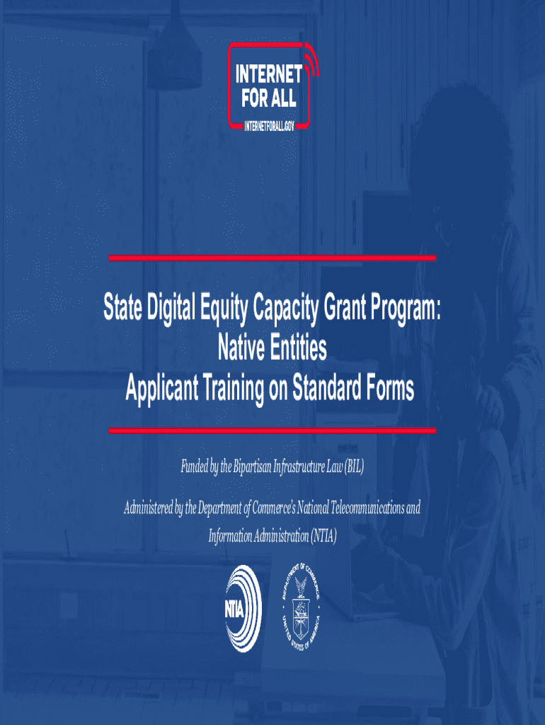 This document serves as an instructional guide for applicants of the NE Capacity & Planning Grant Program, specifically for Native Entities. It outlines the necessary standard forms, application procedures, and eligibility requirements essential for accessing funding under the Digital Equity Capacity Grant Program funded by the Bipartisan Infrastructure Law.