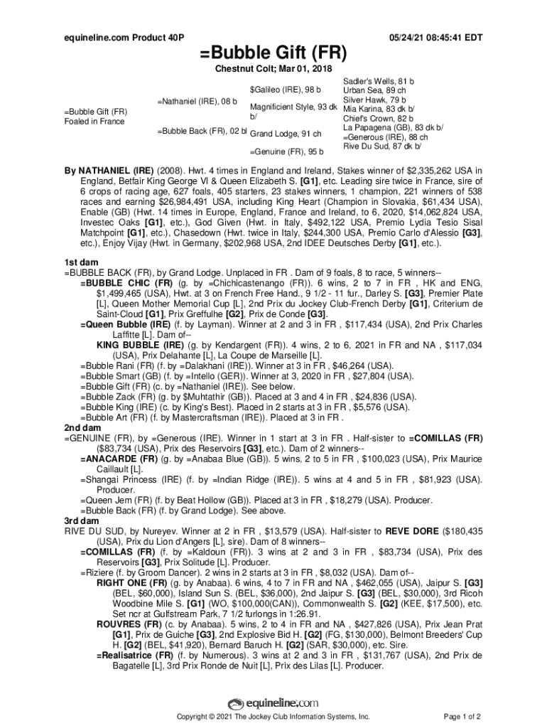 equineline.com Product 40P05/24/21 08:45:41 EDTBubble Gift (FR) Chestnut Colt; Mar 01, 2018 Sadler\'s Wells, 81 b Urban Sea, 89 ch Silver Hawk, 79 b Nathaniel (IRE), 08 b Magnificient Style, 93 dk