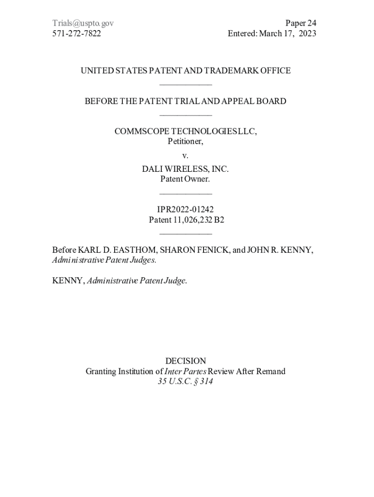 This document details the decision of the Patent Trial and Appeal Board granting the institution of an inter partes review (IPR2022-01242) regarding U.S. Patent No. 11,026,232 B2, concerning a wireless system and methods for handling radio resources managed by a central node and distributed to wireless access points. The document also discusses related district court litigations and contested claims.