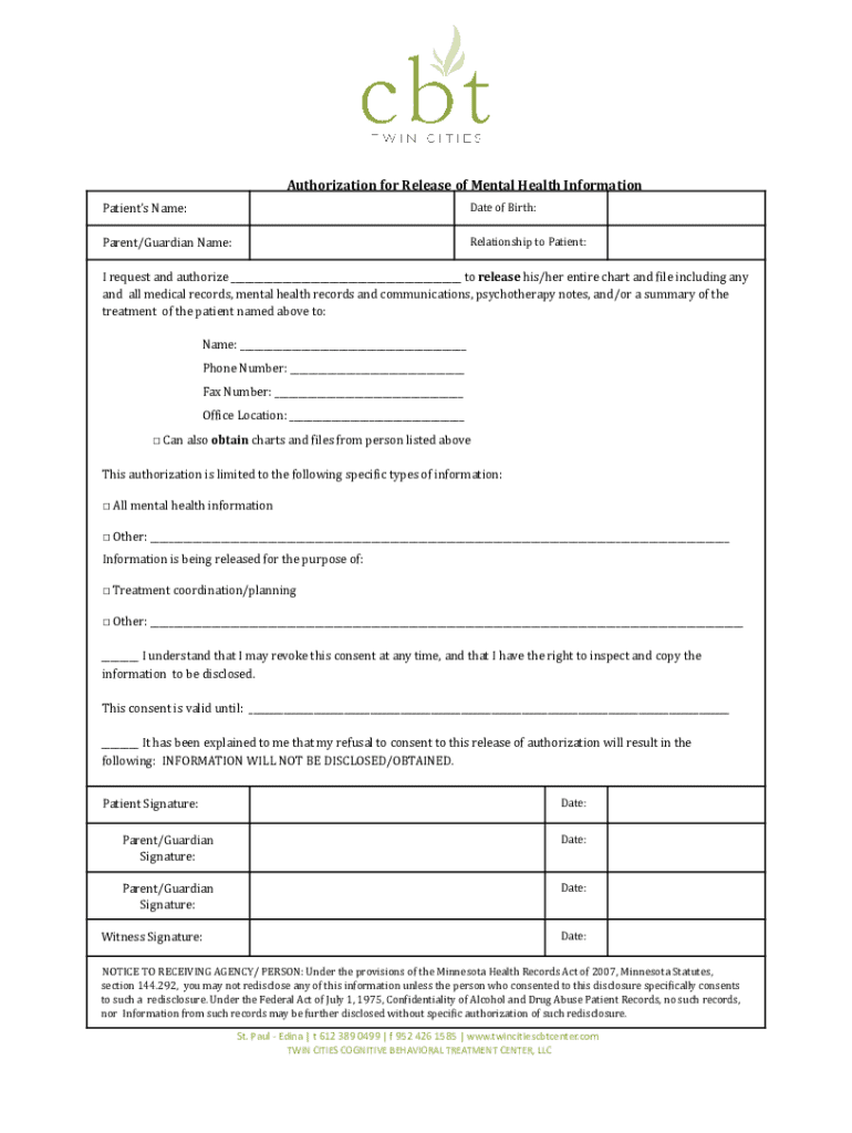 Authorization for Release of Mental Health Information Patients Name:Date of Birth:Parent/Guardian Name:Relationship to Patient:I request and authorize ___ to release his/her entire chart and file