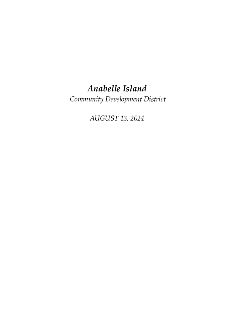 This document outlines the agenda for the Anabelle Island Community Development District meeting scheduled on August 13, 2024. It includes details regarding the roll call, public comments, financial reports, and proposed resolutions regarding budget and amenity policies. Additionally, it contains minutes from previous meetings and various administrative and operational reports.