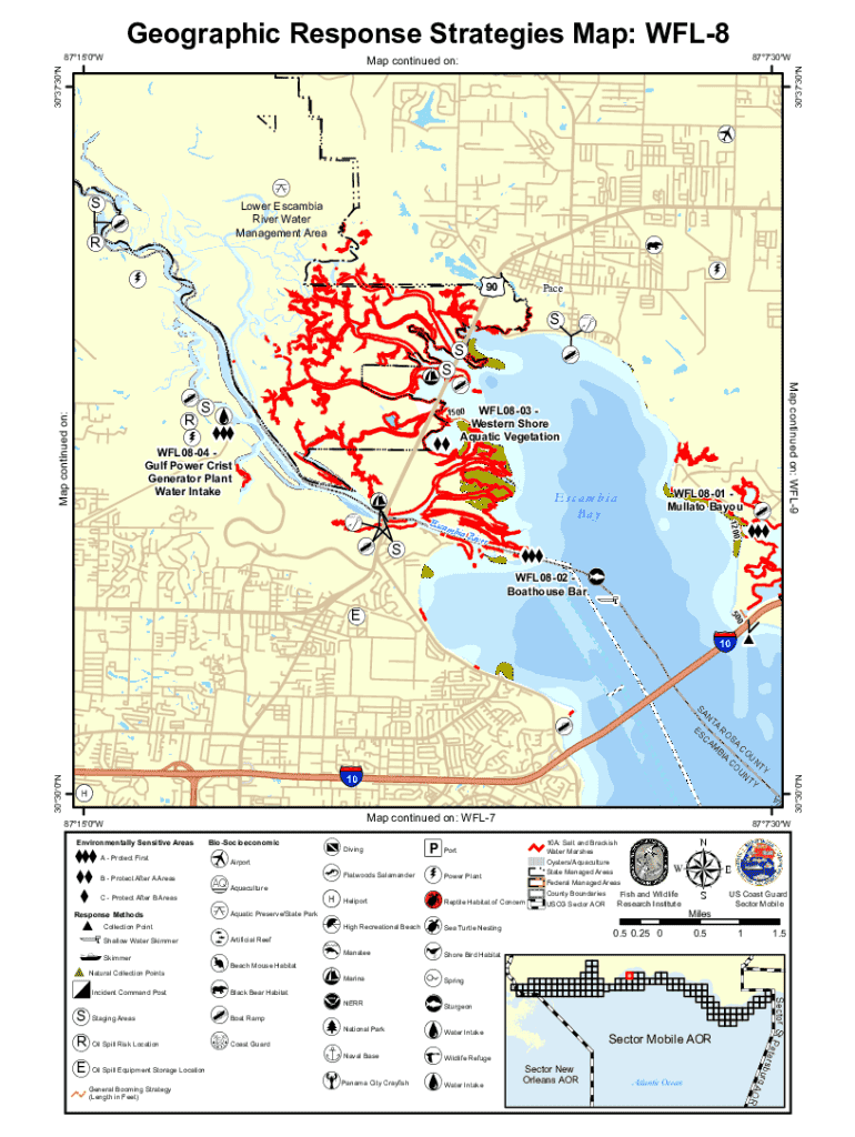 This document includes a detailed geographic response strategy map focused on oil spill risk assessment along the Escambia River and surrounding areas. It highlights sensitive environmental locations, response methods, staging areas, and contact information for relevant authorities involved in emergency response and environmental protection.