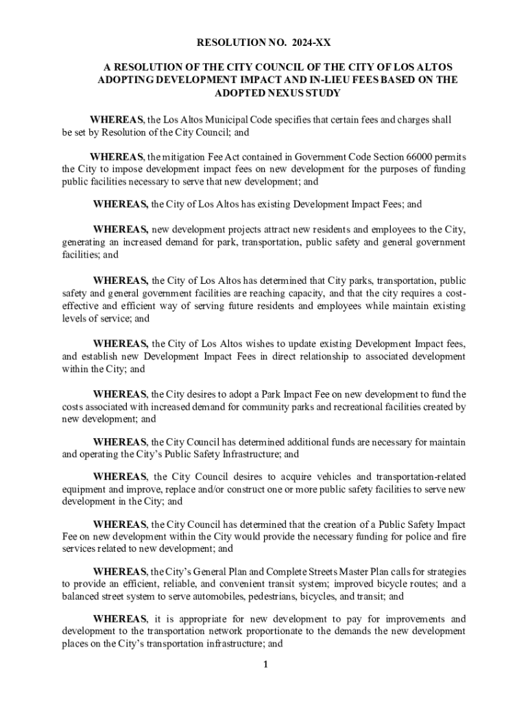 This resolution details the adoption of new development impact and in-lieu fees by the City Council of Los Altos, based on a Nexus Study to support necessary funding for public facilities and infrastructure due to increased demand from new developments. The fees target various areas, including parks, public safety, general government, transportation, public art, and affordable housing.