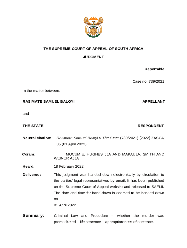 `THE SUPREME COURT OF APPEAL OF SOUTH AFRICA JUDGMENT Reportable Case no: 739/2021 In the matter between: RASIMATE SAMUEL BALOYIAPPELLANTand THE STATE Neutral citation:RESPONDENT Rasimate Samuel Baloyi