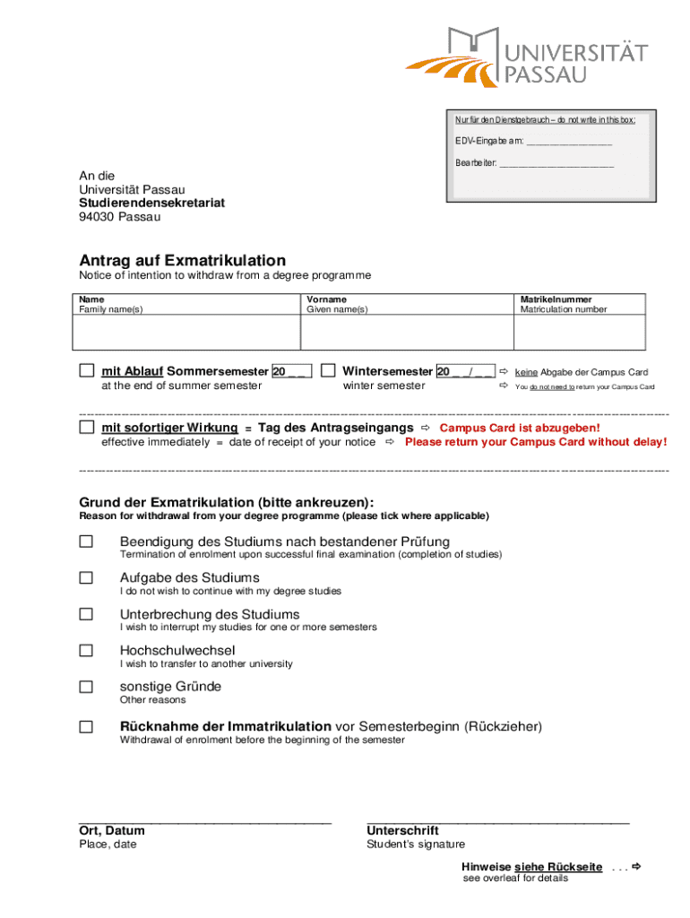 Nur fr den Dienstgebrauch do not write in this box:EDVEingabe am: ___ Bearbeiter: ___An die Universitt Passau Studierendensekretariat 94030 PassauAntrag auf Exmatrikulation Notice of intention to