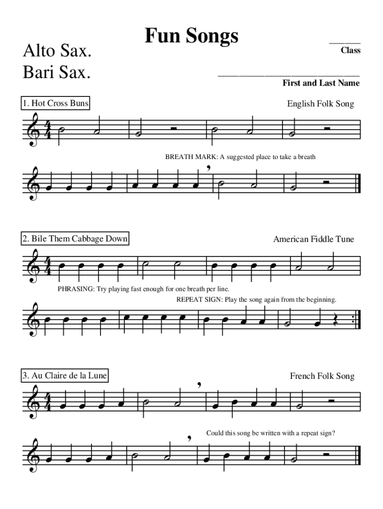 Fun SongsAlto Sax. Bari Sax.Class___ First and Last Name1. Hot Cross Buns4 &4 ___English Folk Song ,BREATH MARK: A suggested place to take a breath & 2. Bile Them Cabbage Down4 &4American Fiddle Tune