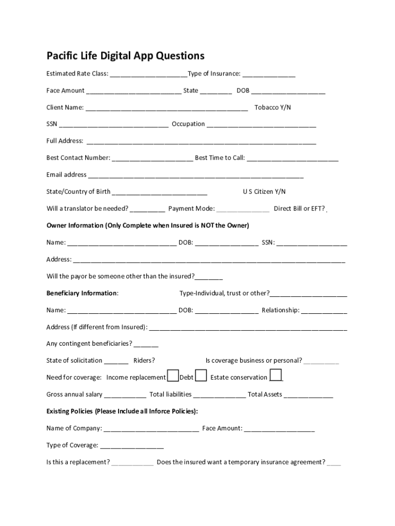 Pacific Life Digital App Questions Estimated Rate Class: ___Type of Insurance: ___ Face Amount ___ State ___ DOB ___ Client Name: ___ Tobacco Y/N SSN ___ Occupation ___ Full Address: ___ Best Contact