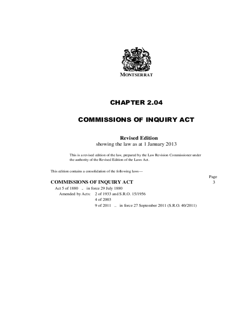 This document provides the revised edition of the Commissions of Inquiry Act for Montserrat, showing the law as of January 1, 2013. It details the powers granted to the Governor to appoint commissions of inquiry, outlines the roles and responsibilities of commissioners, and includes provisions regarding the conduct of inquiries and the treatment of witnesses.