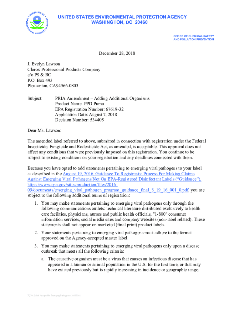 This document outlines the approval by the U.S. Environmental Protection Agency for the product PPD Puma, EPA Registration Number 67619-32. It covers the amendments to the product label that allow for claims against emerging viral pathogens, detailing specific conditions and communication guidelines that the manufacturer, Clorox Professional Products Company, must adhere to. The document also includes information about the product\'s active ingredients, safety precautions, and its approved uses.