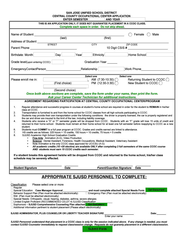 SAN JOSE UNIFIED SCHOOL DISTRICT CENTRAL COUNTY OCCUPATIONAL CENTER APPLICATION ENTER SEMESTER AND YEAR THIS IS AN APPLICATION ONLY; IT DOES NOT GUARANTEE PLACEMENT IN A CCC CLASS. Complete each space