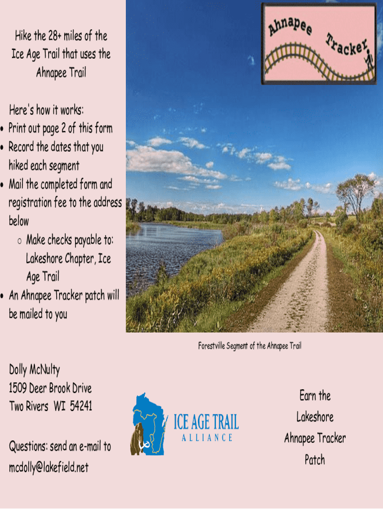 This form is for hikers to log their completion of segments of the Ahnapee Trail, a part of the Ice Age Trail in Wisconsin, in order to earn the Ahnapee Tracker patch. Participants must print out the form, record their hiking dates, and submit it along with the registration fee.