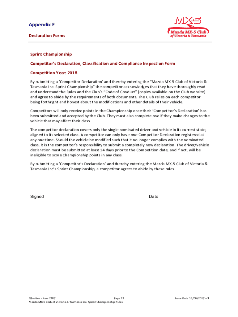 AppendixE DeclarationForms SprintChampionship CompetitorsDeclaration,ClassificationandComplianceInspectionForm CompetitionYear:2018 BysubmittingaCompetitorDeclarationandtherebyenteringtheMazdaMX5ClubofVictoria&