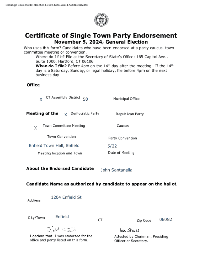 DocuSign Envelope ID: 3DE8554139014A5EACB4A981EB6D735DCertificate of Single Town Party Endorsement November 5, 2024, General ElectionWho uses this form? Candidates who have been endorsed at a party