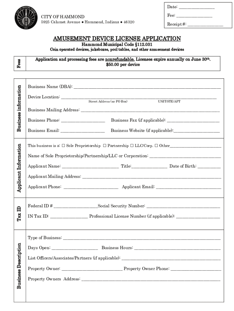 This document is an application for obtaining an amusement device license in the City of Hammond, Indiana. It requires applicants to provide business and personal information, pay nonrefundable fees per device, and ensures compliance with local regulations. Licenses must be renewed annually.