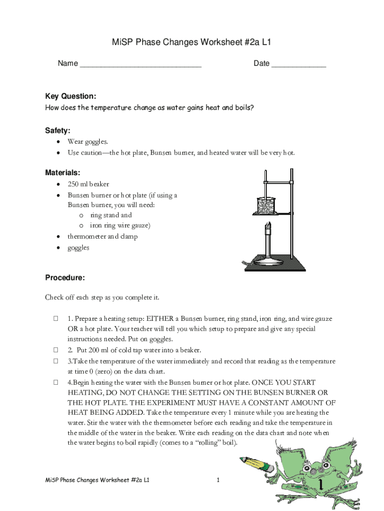 MiSP Phase Changes Worksheet #2a L1 Name ___Date ___Key Question: How does the temperature change as water gains heat and boils?Safety: Wear goggles. Use cautionthe hot plate, Bunsen burner, and heated