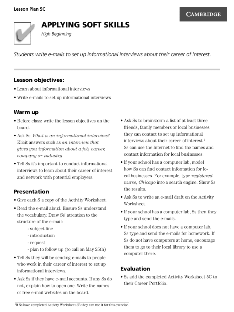 Lesson Plan 5C4APPLYING SOFT SKILLS High BeginningStudents write emails to set up informational interviews about their career of interest.Lesson objectives: Learn about informational interviews Write