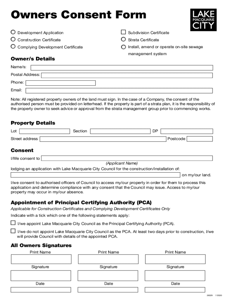 Owners Consent Form Development ApplicationSubdivision CertificateConstruction CertificateStrata CertificateComplying Development CertificateInstall, amend or operate onsite sewage management systemOwner/s