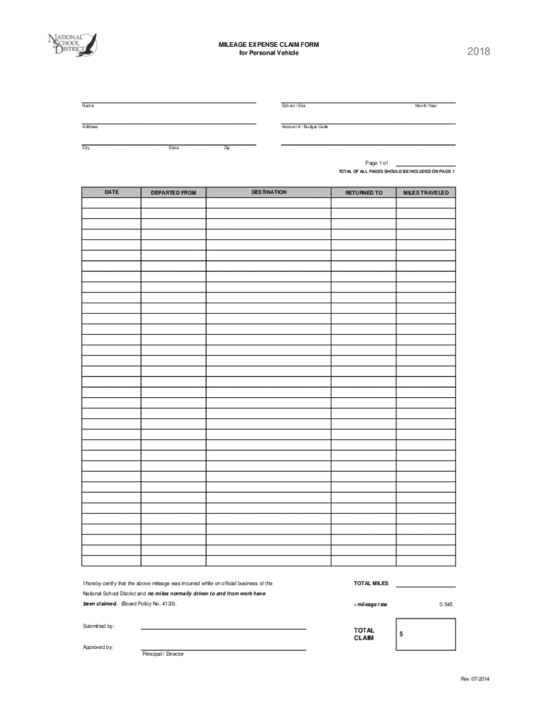 MILEAGE EXPENSE CLAIM FORM for Personal VehicleNameSchool / SiteAddressAccount # / Budget CodeCityState2018Month/YearZipPage 1 of TOTAL OF ALL PAGES SHOULD BE INCLUDED ON PAGE 1DATEDEPARTED FROMDESTINATIONI