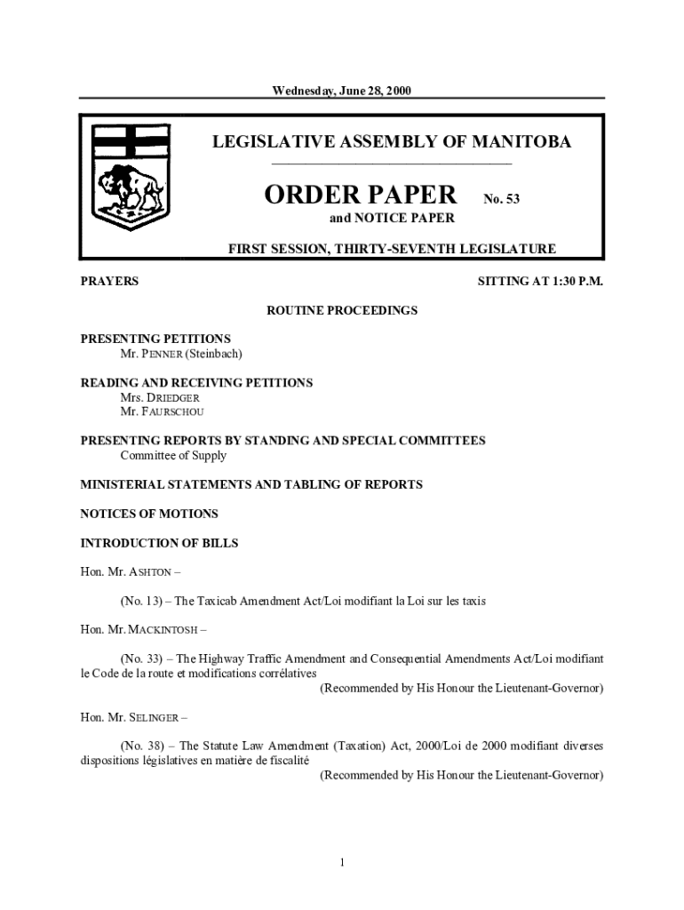 Wednesday, June 28, 2000LEGISLATIVE ASSEMBLY OF MANITOBA ___ORDER PAPERNo. 53and NOTICE PAPERFIRST SESSION, THIRTYSEVENTH LEGISLATURE PRAYERSSITTING AT 1:30 P.M. ROUTINE PROCEEDINGSPRESENTING PETITIONS