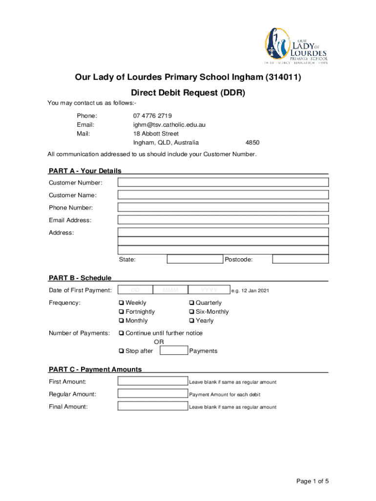 This document serves as a Direct Debit Request (DDR) form for parents and guardians of Our Lady of Lourdes Primary School in Ingham, enabling them to authorize regular payments for school fees and other associated costs. It contains sections for customer details, payment scheduling, amounts, and bank account or credit card authorization, along with terms and conditions governing the direct debit arrangement.