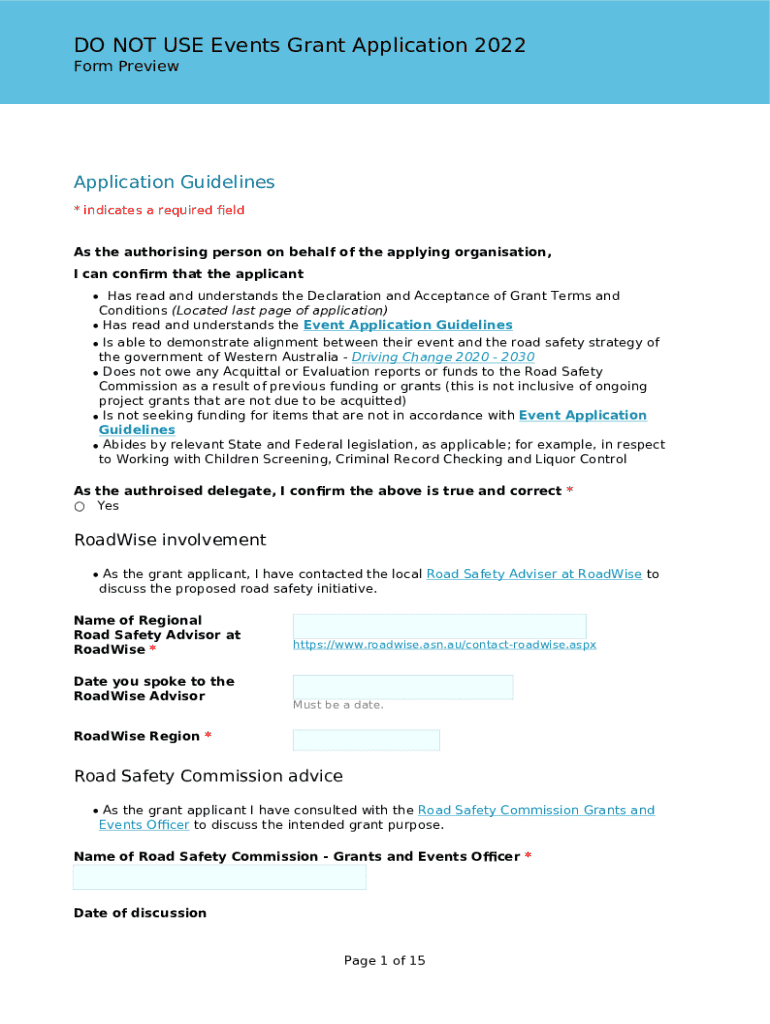 This document serves as an application form for organizations seeking funding from the Road Safety Commission of Western Australia for events that promote road safety. It provides guidelines, necessary declarations, and information on aligning events with government road safety strategies.