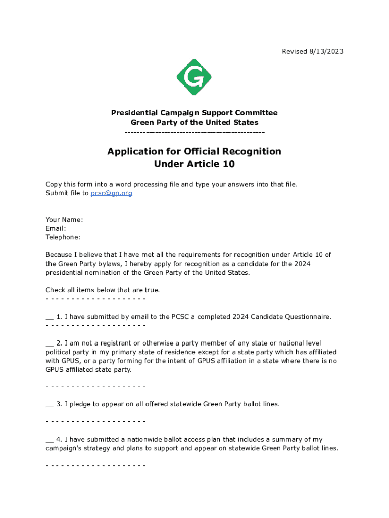 This application form is used for candidates seeking official recognition to run for the 2024 presidential nomination of the Green Party of the United States under Article 10 of the party bylaws. It requires candidates to confirm their eligibility and provide necessary documentation and information to the Presidential Campaign Support Committee (PCSC).